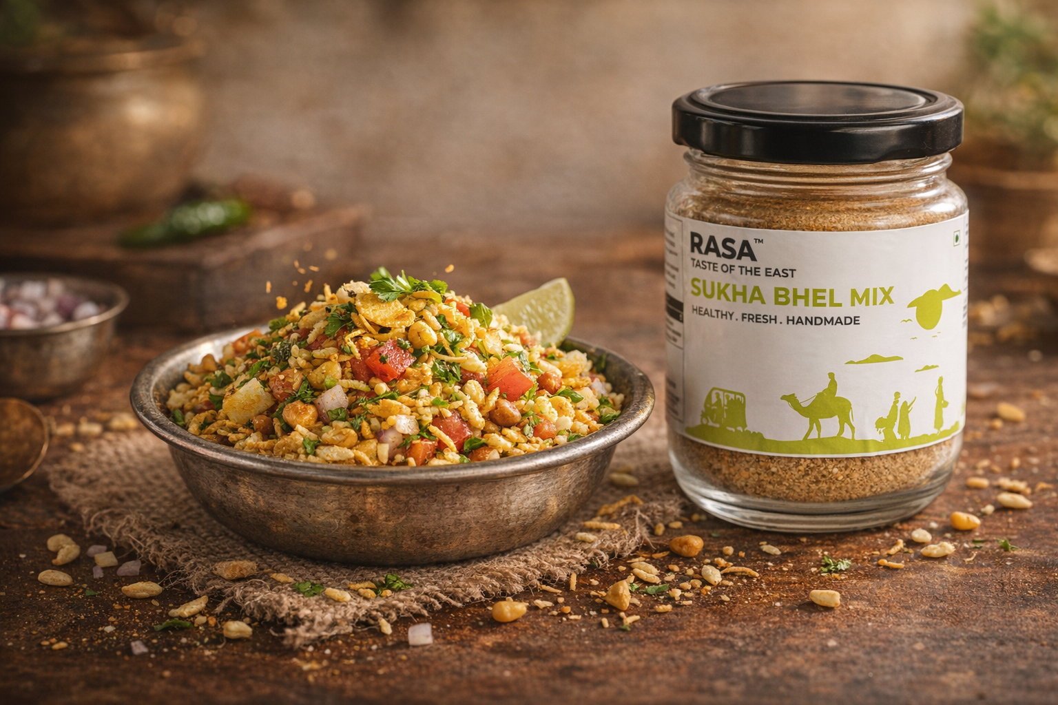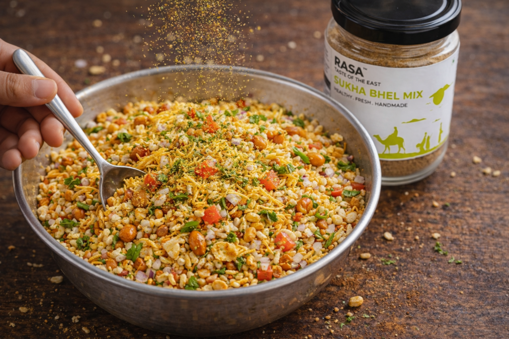 The secret? Rasa Sukha Bhel Mix Chutney — perfectly blended spices that give you that true roadside bhelwala flavour without extra effort.